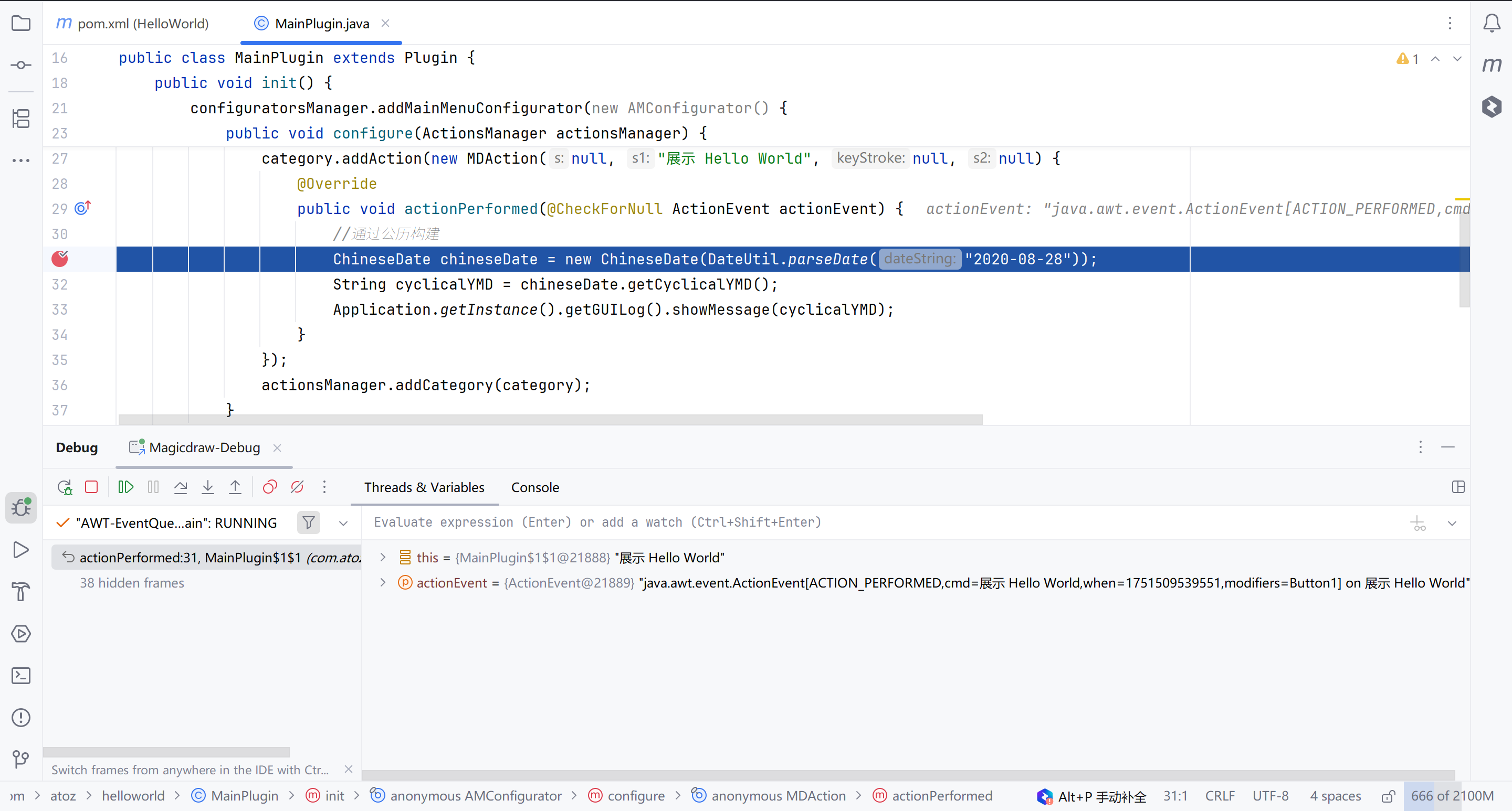 Connected to the target VM, address: 'localhost:5005', transport: 'socket'- 断点调试。