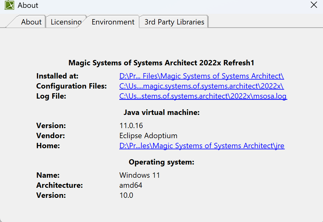 在 Magicdraw 工具中主菜单的 Help->About Maigcdraw 弹窗中可以看到 log 文件地址。