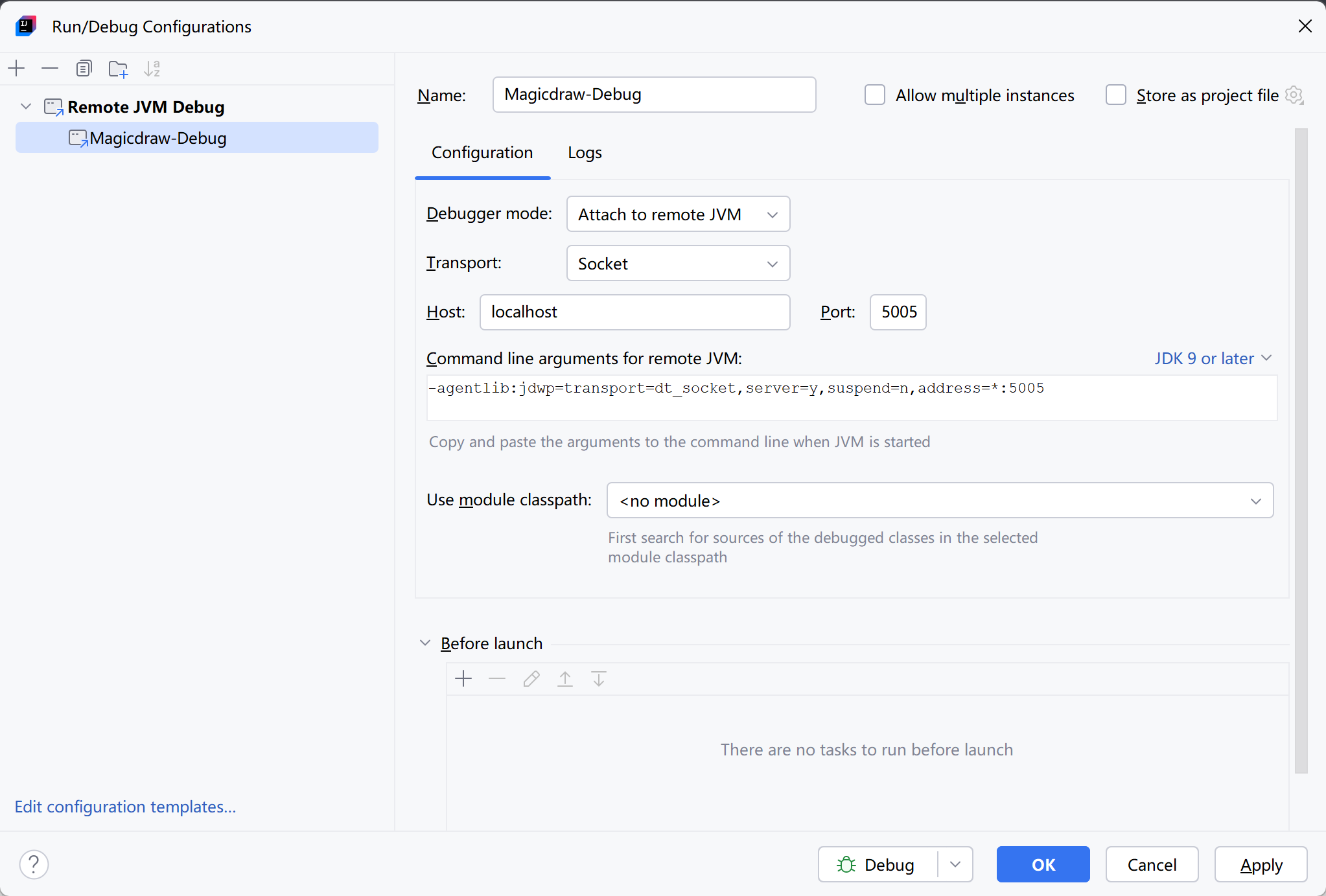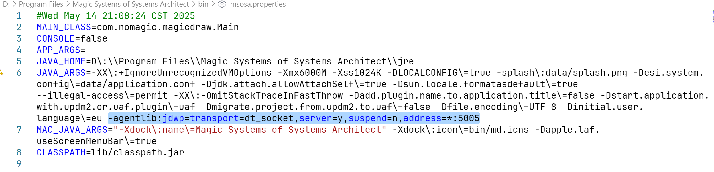 Command line arguments for remote JVM中的内容添加到Magicdraw 根目录/bin/msosa.properties中的JAVA_ARGS后面(注意空格)。