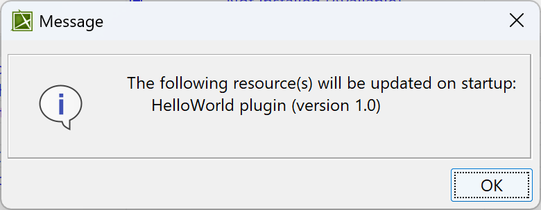 我们先打开 Magicdraw,在主菜单中选择 Help->Resource/Plugin Manager。在弹出的 Dialog 中选择Import按钮,定位到HelloWorld-导入-1.0.zip,确定。成功的话应该会有下面的提示。