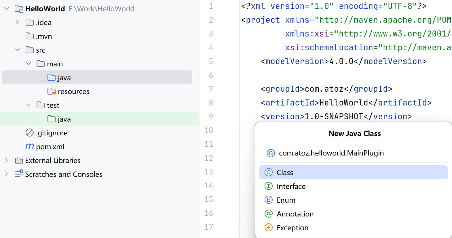 在 java 下新建 com.atoz.helloworld.MainPlugin。