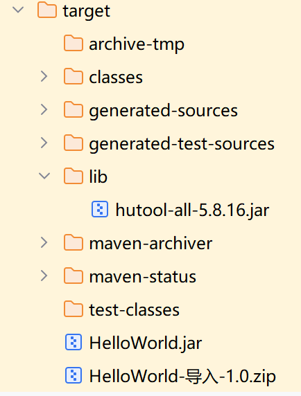 </assembly>此时我们再执行mvn clean package。可以看到在 target 目录下生成了HelloWorld-导入-1.0.zip。